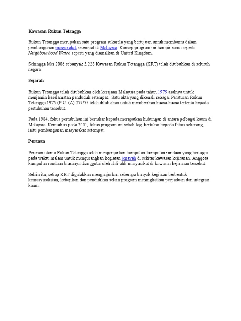 Rukun Tetangga telah ditubuhkan oleh Tub Abdul Rahman pada 29 Ogos 1975 asalnya untuk menjamin keselamatan penduduk setempat. Inilah karangan kebaikan rukun tetangga dan informasi lain yang berhubungan dengan topik karangan kebaikan rukun tetangga serta peluang bisnis investasi keuangan di website ini. This preview shows page 20 - 22 out of 25 pages.